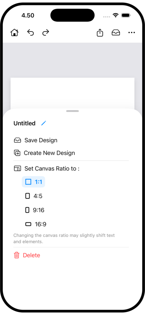 From editor area, tap three dots on the top right to show canvas ratio options.